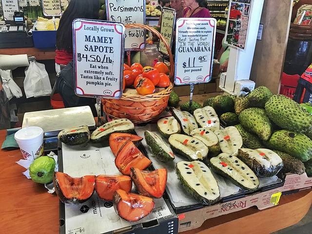 有趣的热带水果!从来没有吃过。下图上的两种水果我们一样买了一小块,提出需要的话他们可以帮切成小块放在塑料盒里,这样就可以直接吃了~ 左边的Mamey Sapote吃着像充满水分的流失南瓜,右边的Guanabana吃着像大型山竹。总之都是很可口的水果!