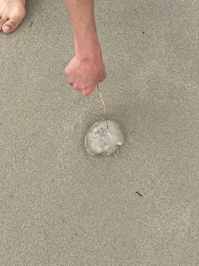 发现了一只被冲上岸的水母,也算是我俩第一次看见野生的水母吧~ 用树枝戳了戳,看来是已经死了 TAT