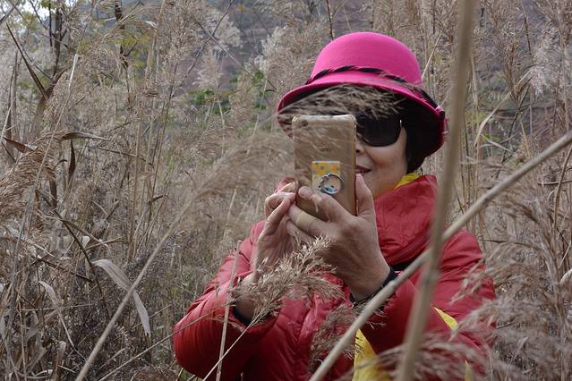 既然出来了,就被分配了艰巨的任务,拿着对讲机,在队尾帮忙押队,因为团里有50个人,行程要走很远,穿梭芦苇荡,登高穿越找皂角树,还要去探寻穆柯寨的地方,去小丹霞地貌看看,我拿着对讲机,跟着走的最慢的阿姨大姐一路慢悠悠的拍照!