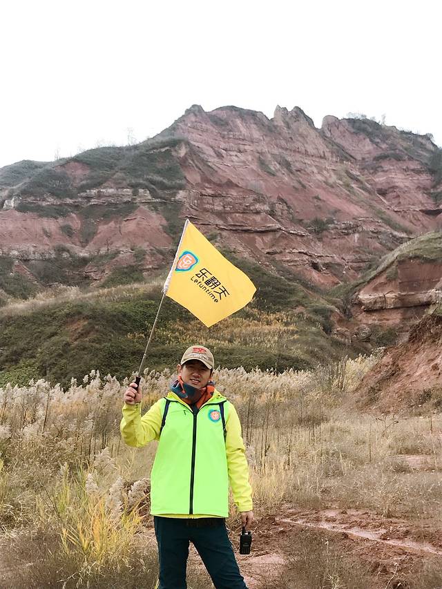 终于走出芦苇荡,小旋风在等所有的客人都过来一起去丹霞地貌。给他拍了一张刚好旗子飞起来的照片,做领队的是不是都有点黑!