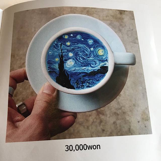 下午去了附近的梨泰院做拉花特别有名的씨스루咖啡厅,据说是韩国做拉花咖啡店第一人,店里还有两个帅气小哥哥,难怪店里都是漂亮的小姐姐了,点了个普通的拉花咖啡,图片上那副画很好看,不过要店长不经常在店里,要提前预约,店长亲自来做。不过价格也确实不便宜啊,听说提前预约还可以把自己的照片发过去按照片做拉花呢,当然价格更贵,貌似要4-5万韩币(240-300人民币左右)