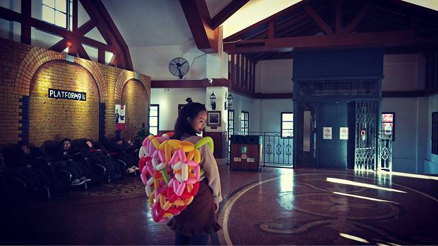 回程的火车站,等车的时候问一个小朋友借来拍照的。这个大桃心气球也是他们捏的,免费送~