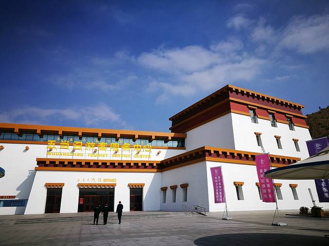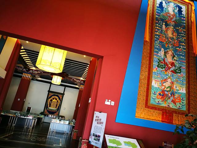门票也是去哪儿网上买的,停车场下来以后就是一个大酒店,再往前走就是一个崭新崭新白地晃眼的藏式建筑——五当召游客服务中心。走进去简直是富丽堂皇,挑高大概有十米的门厅,挂着一幅幅色彩鲜艳的唐卡,原来这里还是购物中心,卖唐卡藏饰等。