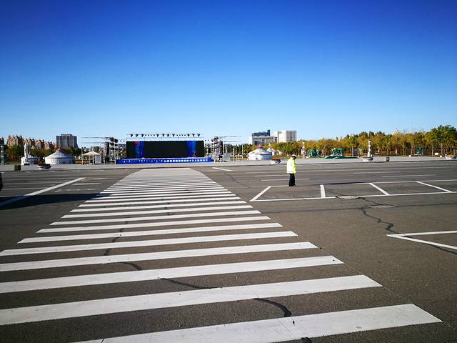 从蒙古象棋广场一直骑到湖滨路,巨大的绿地公园一个接一个,绝对是跳广场舞的好地方。既然这么空旷,那一定要压压黄线才行,警察叔叔就在马路对面,不过没关系,真的一辆车都没有。