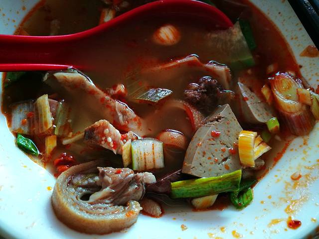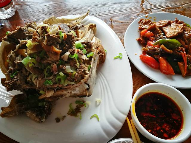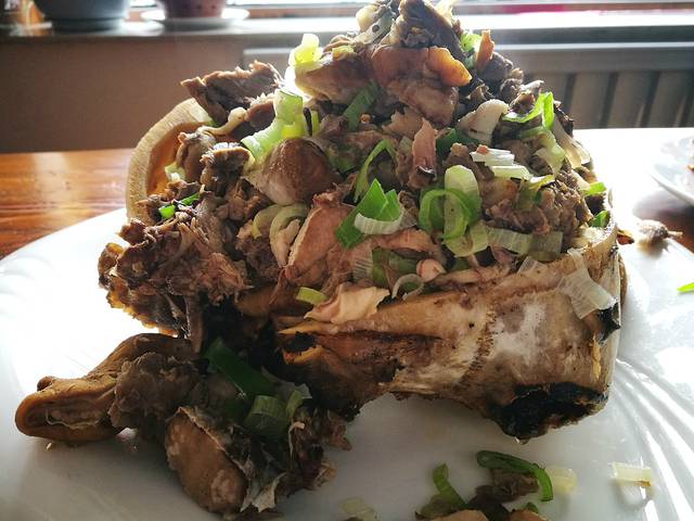 在风沙里奔波了一整天,感觉又黑了一圈,不过这么美丽的景色养眼,很是值当。只可惜委屈了肚子,景区里面基本没有什么像样的饭店,二道桥那里好像有几个,也无非是卖烤香肠烤玉米之类的,实在让人提不起胃口。走回青旅的路上,路过昨天看到的“从头到蹄”,看招牌就知道是吃羊肉的,内蒙的羊肉也是不能错过啊。我去的时候还早,不到五点,算是第一个客人吧。点了一个羊头捣蒜,60块钱,后来发现这是每桌必点菜。味道真不错,羊头肉很酥烂,而且不只是全瘦肉,肥瘦相间还有软骨,很有滋味。北方的菜量那真是实在,我拼命吃了很久,感觉整个羊头还跟没动过一样,只能打包了。