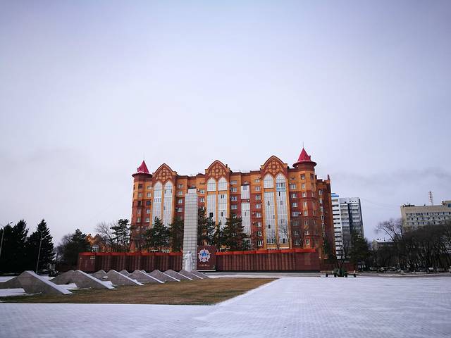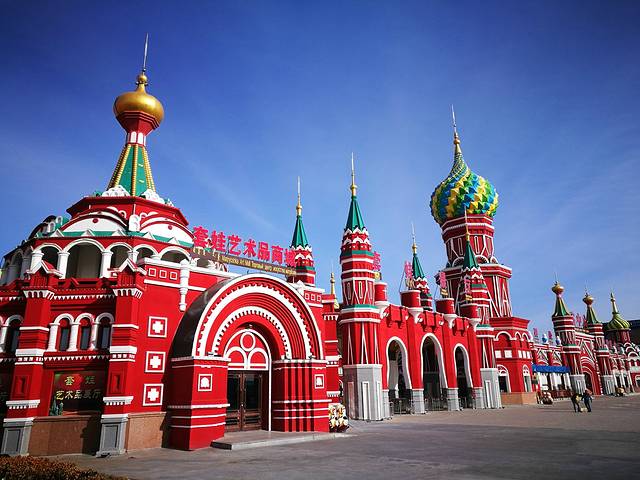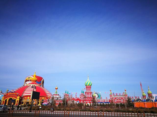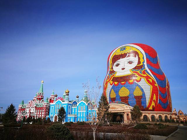 从国门出来,公共汽车往回坐几站就是套娃广场。巨大的红红黄黄蓝蓝像格林童话里的建筑一字排开几公里,想错过都很难。挑了一座以为是俄罗斯艺术博物馆的房子准备进去看看,在门口被人家拦下来,说这里是办公楼。办公楼的旁边就是套娃酒店,挺有特色。旁边的套娃广场,旺季门票要148,现在淡季只要50块,倒是划算。不过看攻略说里面最值得看的一个套娃秀,现在也没有开放,景区里空空荡荡地没有人,就没进去了。