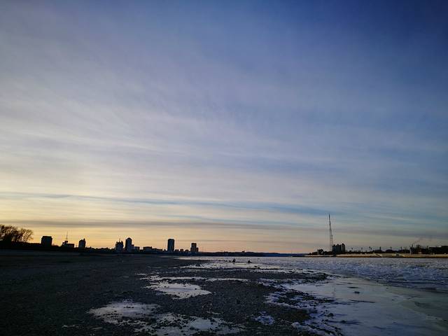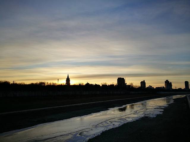 从博物馆出来又暴走,走到黑龙江边,这江景真是怎么看也看不腻啊!蓝蓝的天,雪白的大地,无声漂浮的冰块,对面就是昨天去过的海兰泡,那凯旋门、胜利广场原来是这么地近在咫尺啊!不知不觉在江心公园走到三点半,又是日落。
