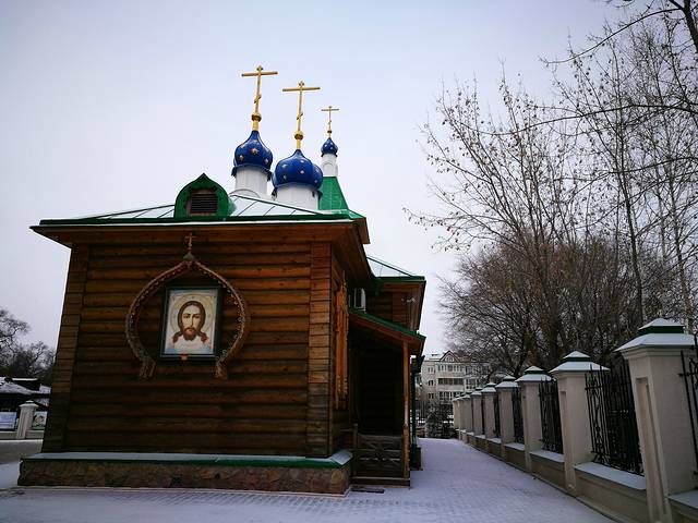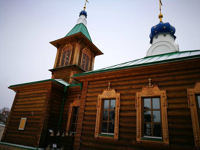 第二站海兰泡报喜大教堂。这座150年以前修建的东正教大教堂,看起来很新。教堂主体是白色的,金色的洋葱头和蓝色绿色的屋顶,有别于我们在莫斯科和圣彼得堡看到的那些花花绿绿,感觉更加清爽大气。教堂里面给我们安排了一个会说中文的金发俄罗斯姑娘当志愿者讲解,她一开口说中文我真的是忍不住想笑,我也知道这实在是太不礼貌了,但真的忍不住啊,只能狂咳嗽遮掩过去。姑娘其实很可爱,就是那个中文口音实在是太奇怪了。她主要介绍了一些关于上帝、圣母玛利亚等等的常识,然后带我们来到不同的殿堂,有一些殿堂是为了还在世的人祈祷的,有一些则是为已经死去的人祈祷的。教堂里人不多,主要是几位俄罗斯大妈,很虔诚地点燃蜡烛,低头静思。
