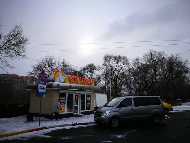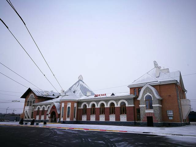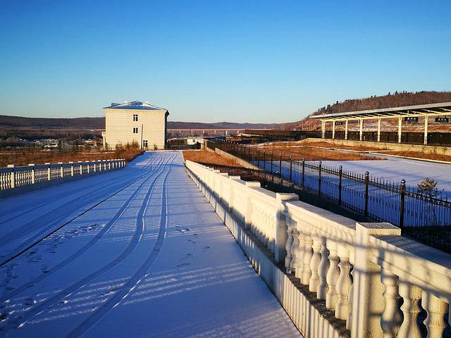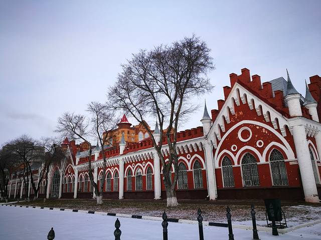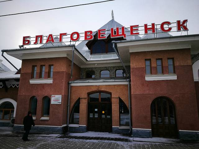 第一站海兰泡火车站,红红的房子在白雪的映衬下格外好看,很有俄罗斯风情。从这里可以坐火车到莫斯科,听说要142个小时,整整6天,妈呀,估计方便面也要吃到吐。站前广场上有两个小便利店,买个热狗肠当早餐填填肚子。