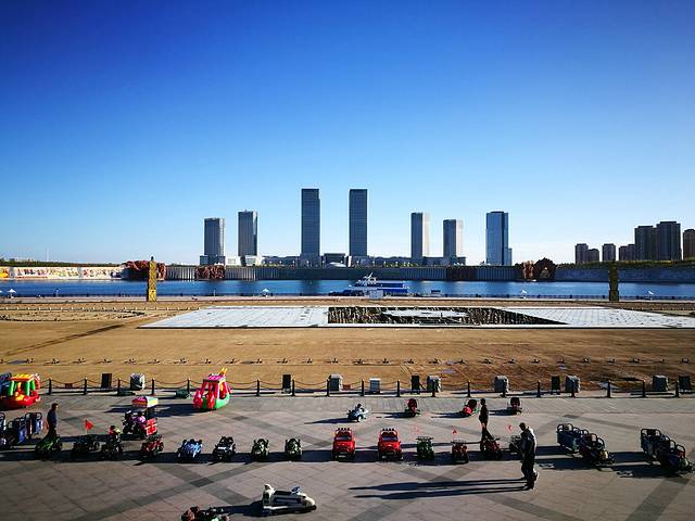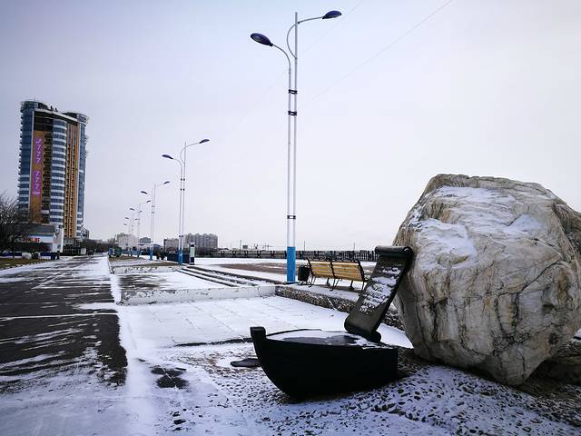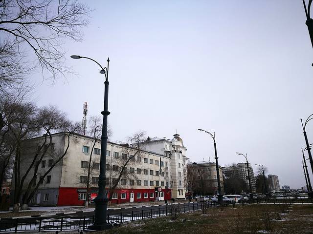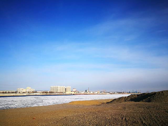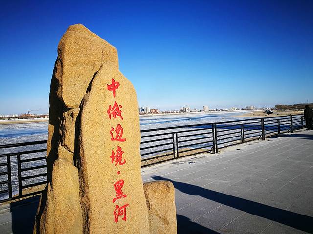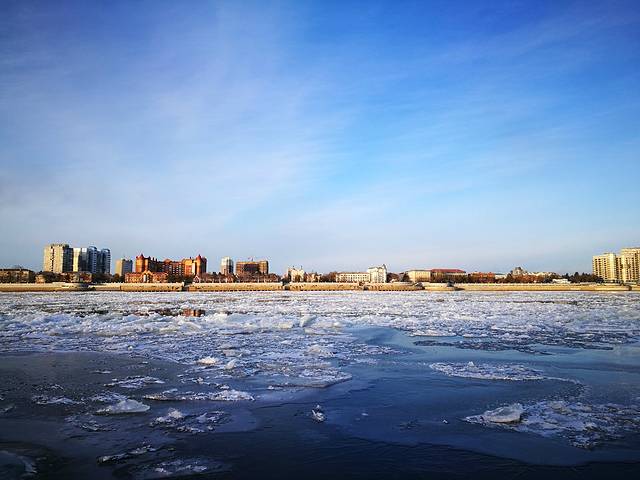 有滨江大道和沿江公园,隔着飘满浮冰的黑龙江,对面就是黑河。江边拔地而起一座座高楼大厦,上面横幅挂着地产商的联系电话,导游说这里的公寓也要卖到一两万一平方米,而当地人平均工资收入也就两三千一个月而已,都是中国人在这里炒房炒起来的。