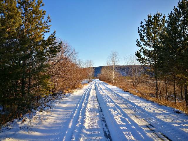 吃完饺子喝完小酒差不多一点钟,想着出去走走,没想到这一走就走到四点半。先沿着地图,继续往北穿出村子,走进被白雪覆盖的农田和乡村马路,这时候的太阳还是软绵绵的在云层后面,前后基本见不到人影,偶尔有一两部车子开过去,在城市里呆惯的人啊,来到没有人的地方就有点害怕,还大白天的呢。有的时候结冰的地方有点滑,尽量走在路边积雪的地方。走啊走啊,走了大概一个小时,终于来到了金鸡之冠。