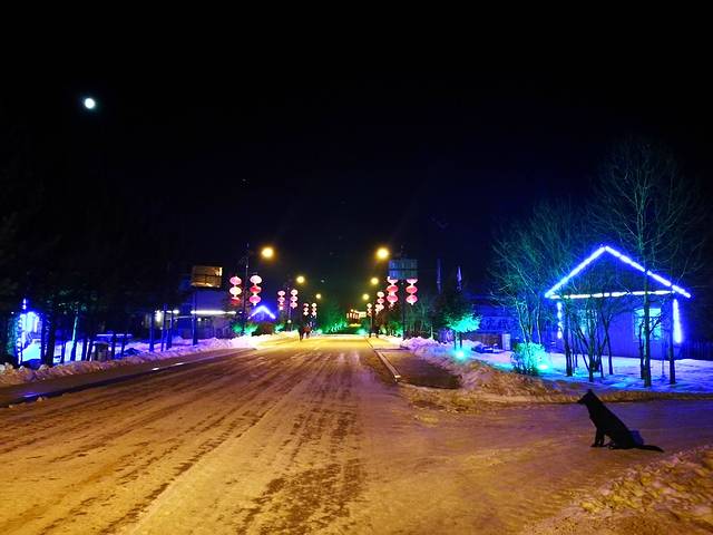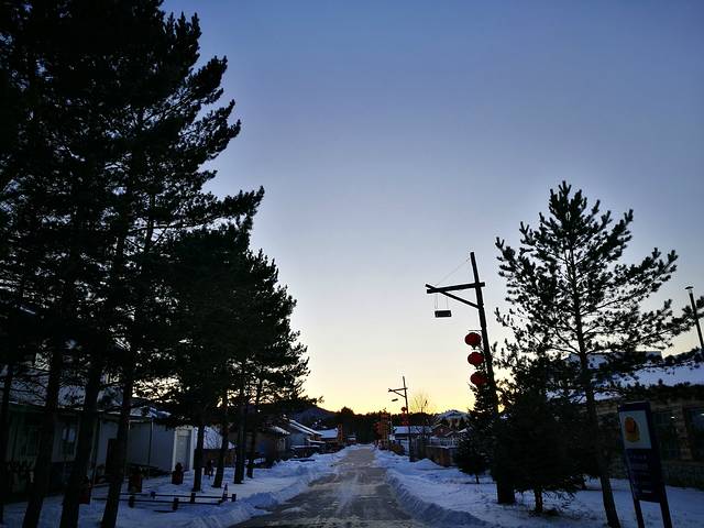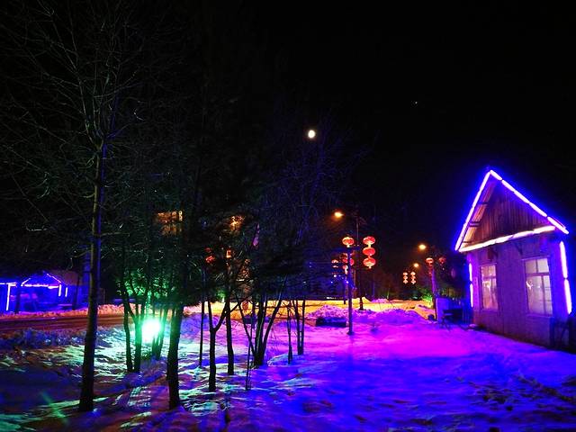 回家的路上,四点半左右,太阳已经落山了,倒是山后面的霞光还温柔地笼罩着大地。回到暖气十足的小屋子里,打开电脑,一边大口吃鸡,大口喝啤酒,一边看美剧,有网络的地方,世界大同。吃地一高兴,手一抖啤酒打翻了大半瓶,虽然才五点半,可是外面已经全黑了啊。怎么办,啤酒可不能断了供给。趁着酒意,把大羽绒服裹起来,围巾塞塞好,跑去供销社买两罐啤酒回来。没想到路上还能顺便看看北极村的夜景,五颜六色的霓虹灯把黑夜里的白色雪乡映照地格外缤纷,温度虽然比白天下降了不少,但还是没有南方那种刺骨的湿冷来地厉害。