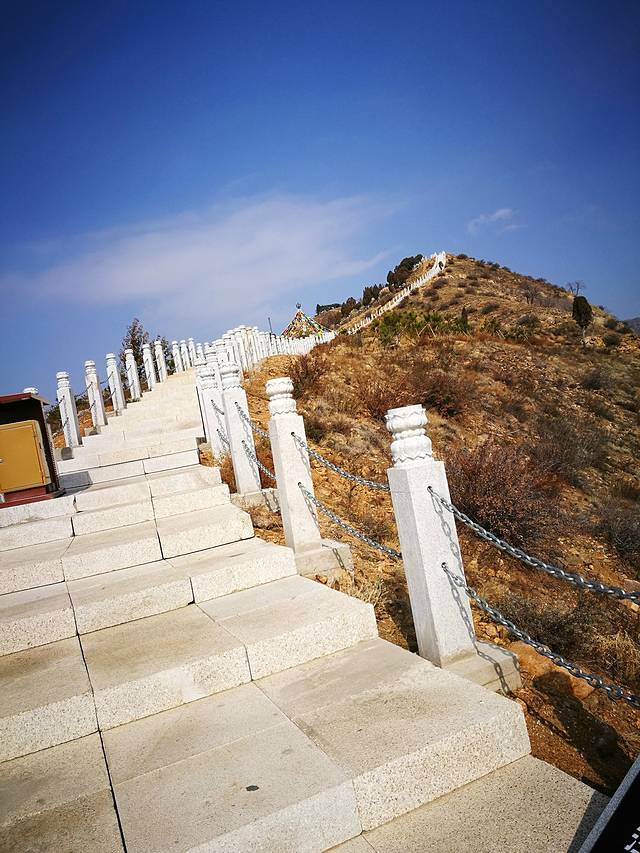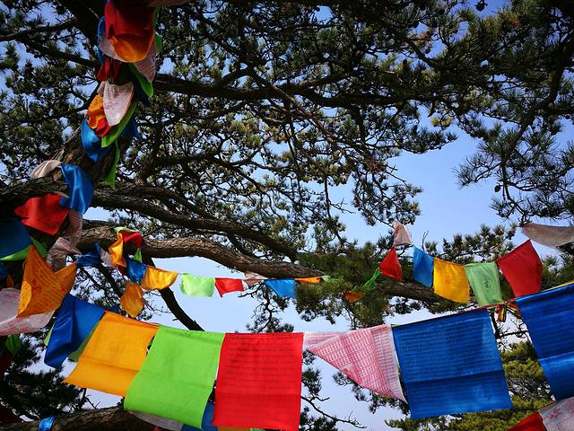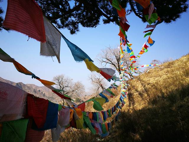 从游客中心出来就可以看到一座小山包,真是天然屏障啊,把五当召好好地藏在里面,不买票还啥都看不到。可以选择乘坐观光车进去,不过走路大概也就十分钟左右。我选择先爬山,再去看庙。修地好好的平整的台阶,两边都是五颜六色的唐卡画在石头上,时不时路过玛尼石堆,五色经幡在风中招展,时刻能够感受到景区精心营造的藏地氛围。