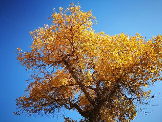 叶子说,你还没来,我们怎敢掉落。蓝天黄沙金叶子,2017胡杨林末班车