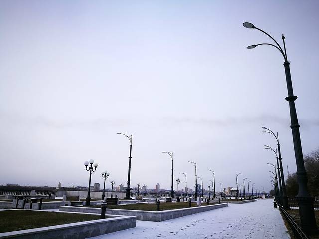 本来以为这里只是个广场而已,没想到却看见了惊艳的黑龙江。头顶上的乌云还是白茫茫灰泱泱的,但远处地平线上小山的顶端已经被扯开了一个小口子,露出了一小块嫩蓝嫩蓝的天空。