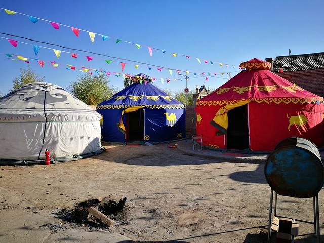 去哪儿网上定的野马,本来定了四晚,后来发现住上两晚实在是足够了,连老板也身在曹营心在汉,准备把帐篷拆了回老家了。老板是一个二十几岁的大男孩小武,他说他的店主要是西安野马,额济纳今年是第一年搞,向当地人一家子租了这个院子一个月,平房里是三个房间,两个大床房,一个床位房;院子里搭起来有六七顶帐篷,也是有床位有单间。我去的那天差不多已经是胡杨林要收尾了,整个旅舍就两个人住着。他说就前一天还住着有二三十个人,晚上在院子里点篝火,烤羊肉,一起喝酒吃饭,可热闹了。