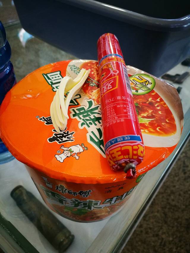 早上也没吃早饭,转机中间大概有个三四个小时,想着机场怎么也能有个饭店啥的吧,没想到,阿拉善机场那么小,下飞机的就我一个人,连行李转盘都不用,直接给我拎出来了,更别说什么饭店了。整个小机场只有一个小卖部,叫“相约特产”,还没人,等了半天,终于买到了一盒泡面,一根火腿肠,再加一个卤鸡蛋,我这到底是坐飞机还是坐火车呀?!