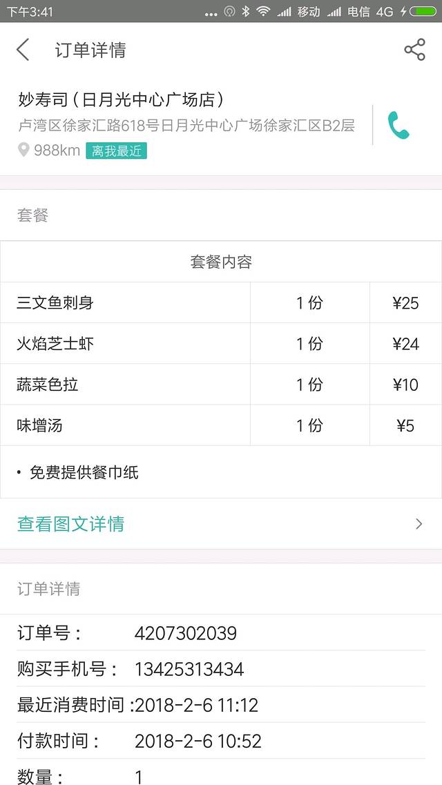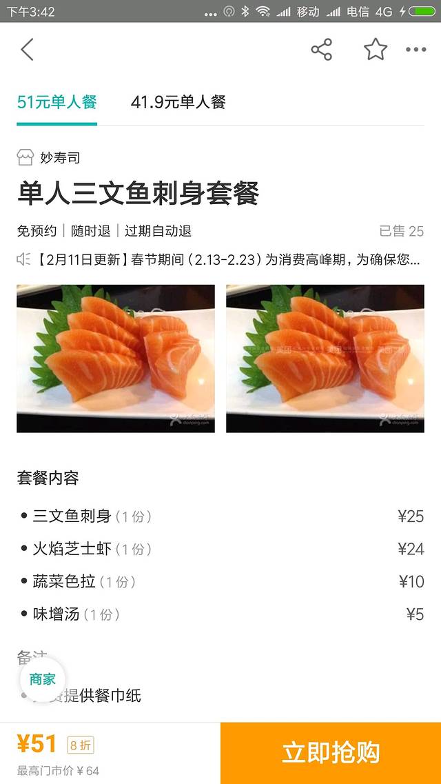 美团团购:妙寿司(单人餐51元)