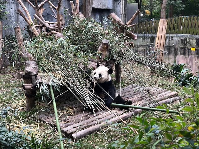 如果你的运气比较好,还可以遇见正在给熊猫喂食的工作人员,举个长长的杆子在投食!这时一定要跟进喂食的人,因为能够拍到熊猫吃东西最好的一面!