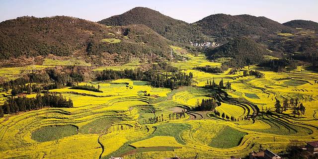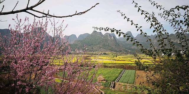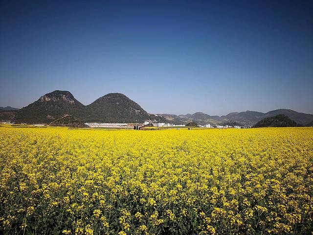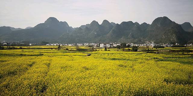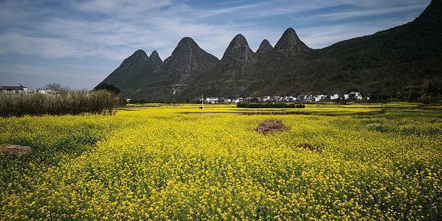 峰林下的村寨,蓝天下的油菜花。