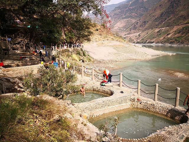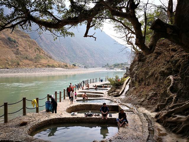 我们沿台阶下到怒江边,10多个澡池沿江滩一字排开,池子是用鹅卵石砌成,大小形状各异,温泉热水顺沟自流进澡池。不少的男女老少已在泡浴,也有游客下池体验。澡堂边的红棉花开满枝头,路边的三角梅等花开得正艳,碧绿的江水在旁边静静流淌,与澡堂一起构成美丽的民俗风景。我俩在池中泡脚拍照,尽兴游玩了50分钟才赶路。