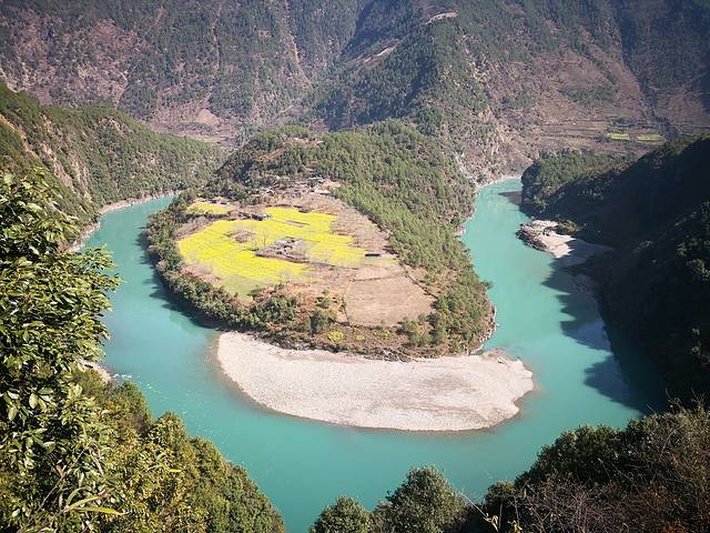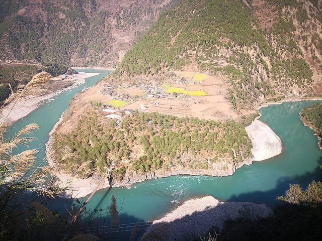 怒江第一湾是丙中洛的主景点。怒江在这里受到大山阻挡,迂迴曲折的奔流,形成一个倒"几"形的江湾。第一湾气势磅礴,风光旖旎,两岸风景独好。蓝天白云之下,此时的湾半岛上油菜花开得正盛,与绽蓝的怒江水相映衬,给壮观的第一湾,增添难以言表的美。湾半岛上有个坎桶村,10多户村民过着世外桃源般的生活。