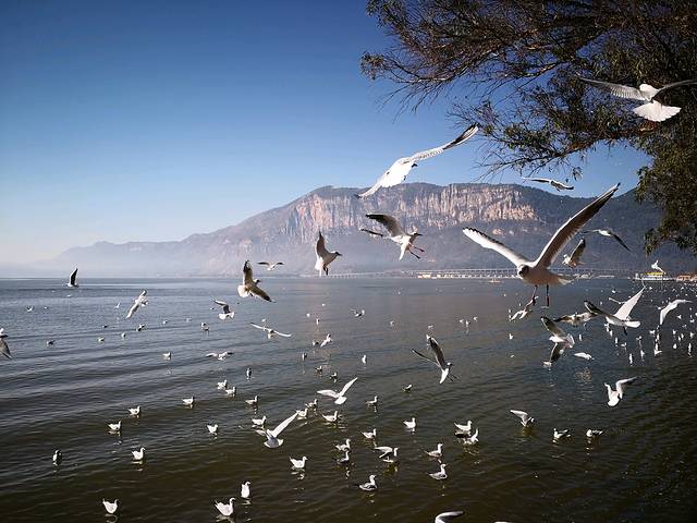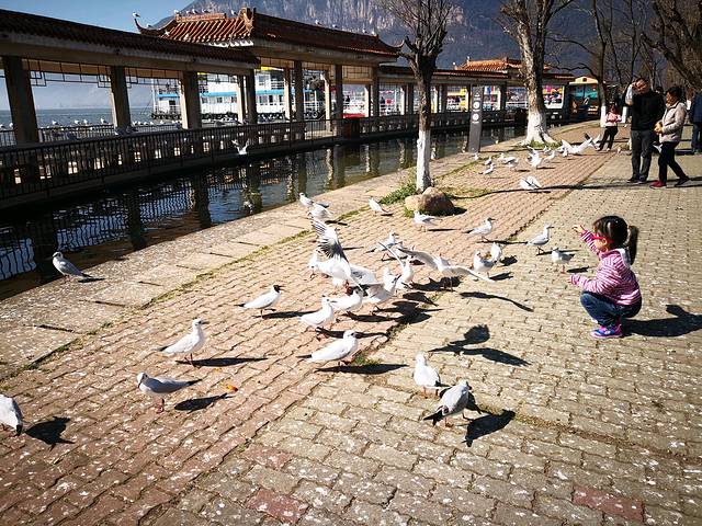 海梗公园位于昆明南郊滇池畔,东西长约2.5公里,宽约200米。公园内建有画阁、石舫、观海长廊、海滨广场,特别是冬季飞来的千万只红嘴鸥,更增添公园的灵气和魅力,是人们休闲、放松心情好场所。今天天气晴朗,成群的红嘴鸥在滇池边上下翻飞。游人买来鸟食在湖边逗喂红嘴鸥,这些小精灵们毫不怯人,也毫不吝惜气力,纷纷飞起啄食游人手上食物。好一幅人鸟和谐相处的精彩画面!
