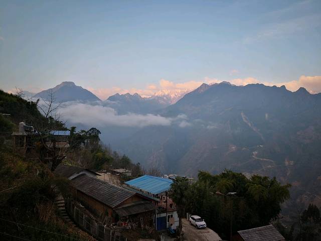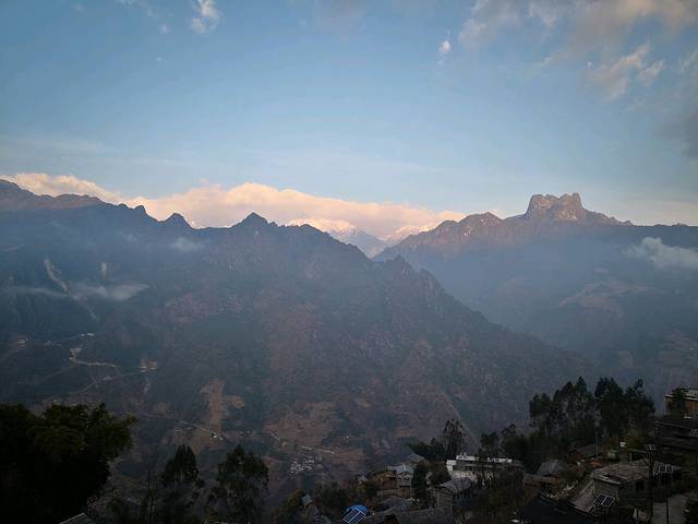 早晨起来到客栈平台拍照。太阳出来了,把对面的皇冠峰染成金黄,远处的雪山也变成金山,白云环绕山间,景色确实很美。