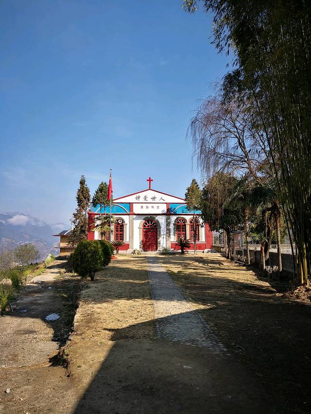 返回老姆登村,直接去基督教堂。据介绍,在怒江地区,基督教、天主教、喇嘛教和藏传佛教都能和谐共处,各自发展。他们都有自己的教堂和众多的信徒。老姆登基督教堂虽说是一个村里的教堂,但和丙中洛重丁天主教堂一样,在怒江却是非常出名的。当地人称怒江一带无毒、无盗、无娼,民风淳朴,恐怕与宗教的传播有很大关系。教堂建在一块开阔的平地上,白墙红窗平房,非常醒目漂亮。背后是村里休闲广场,右边有一池塘。我们去时,礼拜已做完。遗憾!