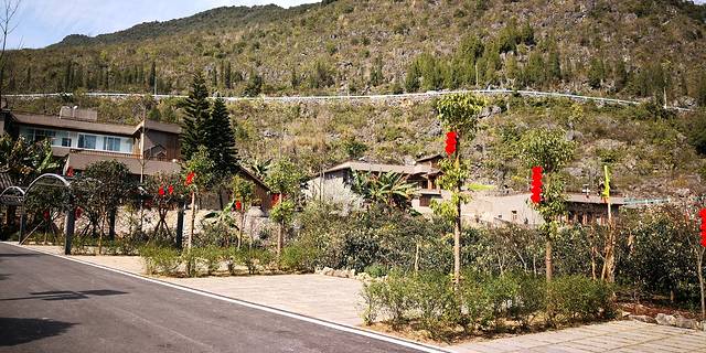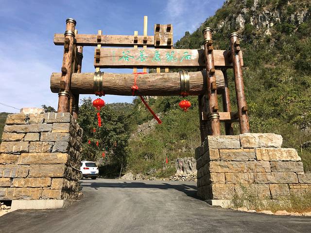 从万佛寺出来,因车多实行交通管制,不能从原路返回。我们只得向南行离开景区,蜿蜒的公路只有一车宽,会车都很困难。在山间行驶了2公里后,意外发现一个新景点——石龙康养谷。这是当地一个新农村建设项目,也是旅游开发扶贫项目。