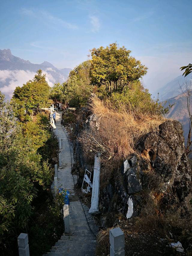 顺着村民指引的路线前进,走了一段土路后,可以看到,前方的路是在山脊上建的,路面已铺上石板,两旁栏杆还没安好。在起伏的石板路上大约走了200多米,就到山峰顶端的观景台。观景台约40平方米,已基本建好。这里视野开阔,远眺对面高黎贡山,群峰巍峨,白云环绕;俯瞰老姆登村历历在目,怒江如綠絲带飘在山间。风景真是美不胜收。同行的三个青年兴奋得大叫"哇塞"!"哇塞"!这里是当地政府投资尚未竣工的旅游景点,是帮助村民脱贫致富的扶贫项目,我们有幸先睹为快呀!