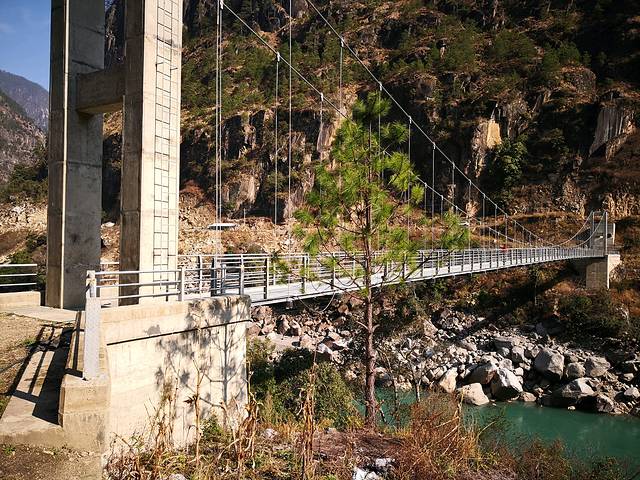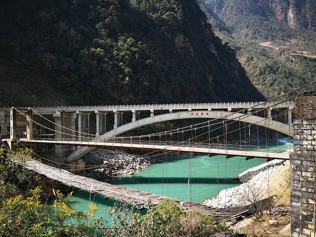 三座桥见证了丙中洛的发展。近处吊桥已废弃;中间吊桥名叫朝红桥,以前的过江通道;远处的水泥公路桥为去年才修的新桥,今年2月才投入使用。