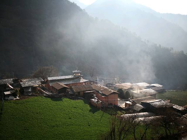 站在观景台上远眺,怒族人的木屋错落有致地建在山坡上,山坡上的庄稼一片葱绿,金色阳光洒满对岸,袅袅炊烟从村中升起,山村的宁静和秀丽跃然画中,景色美得醉人。真不愧为游人点赞的"瑞士田园风光"!