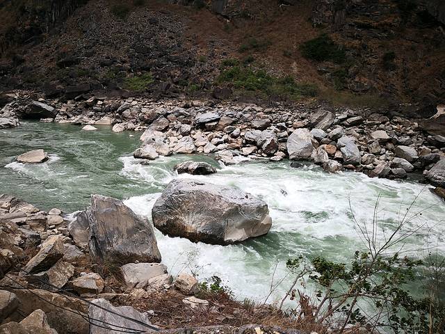 下午4点多钟,经过一处峰峦重叠,峭壁如削的江段,这就是腊玛登景区。也叫"老虎跳峽谷"。这里江中乱石林立,水流湍急,浪花飞溅,"虎跳石"为一块2米见方的巨石。传说,有只老虎就是跳到巨石上面,而一跃跨过怒江的。故名"老虎跳峽"。我们下车简单拍照。