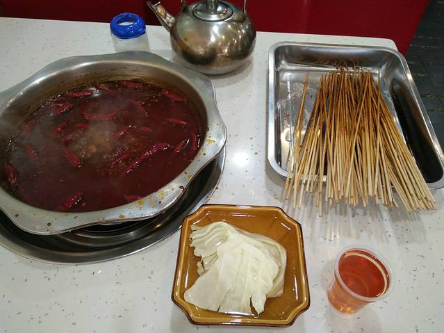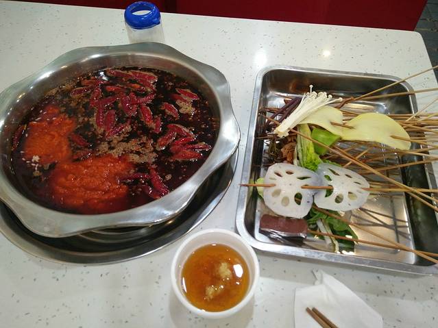 重庆大学对面的一家小店,终于解决了一个人吃火锅的难题,老板说4毛一串,我感觉已经拿了不少了,结果老板娘过来倒茶的时候用重庆普通话告诉我最低消费40,我说之前没说啊,40我吃不完呢,他说她老公刚才有告诉过我,我嘞个去,问题是他刚才说的话除了4毛我一句没听懂,哈哈哈,不过最后事实证明我还是有实力的,吃了54元奥!大胃王就是我。补充一下,红油锅底竟然免费,鸳鸯的+15元,是不是很任性!这算是我吃的最怀念的一顿啦!