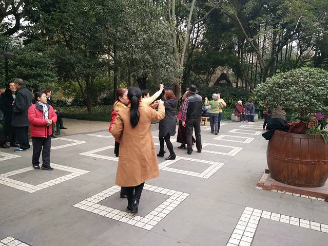 上午九点多,公园里就有一群大爷大妈在翩翩起舞