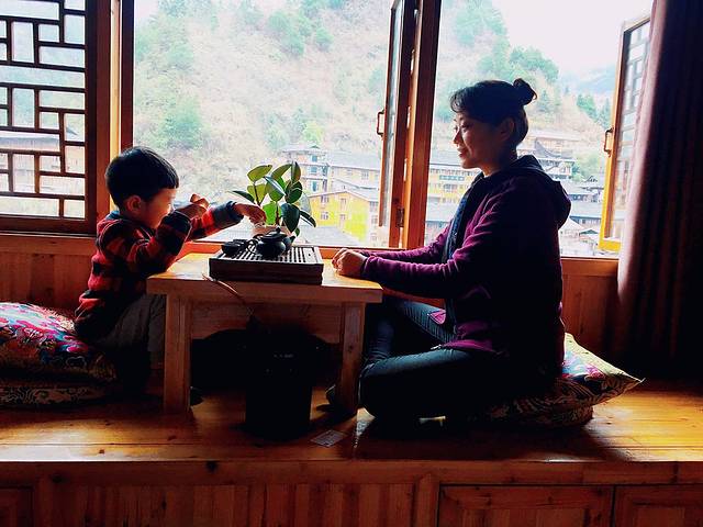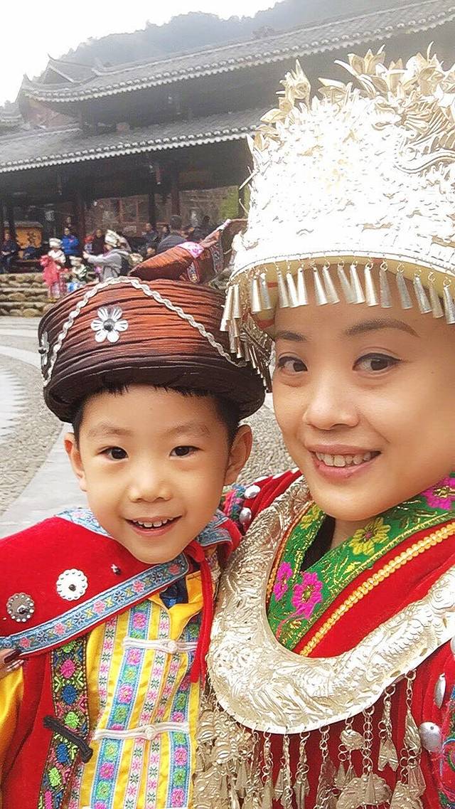 早上9点在日月国际酒店有镇远直通西江千户苗寨的大巴车,票价138每人,包含车票和千户苗寨的门票及寨内转运车票。不过打电话的时候说孩子需要交88元的车票钱,经过讨价还价最终孩子交40元成交。车程大约2个小时,我们到达了西江千户苗寨。