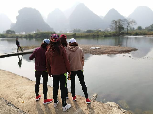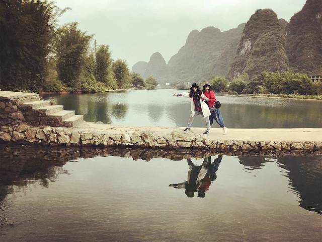有一段绿道原本是建在水面上的浮桥,因漓江水的涨落过大,桥已经损毁了,所以骑着骑着,就到了尽头。还好旁边有座断桥,冬天是枯水期,我们得以从断桥上扛车通过。