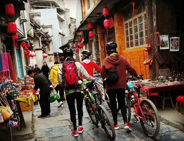 最后一天,从印象江墅客栈出发,穿过十里画廊,到遇龙桥结束。十里画廊已经不允许开车通过,但是自行车可以自由出入。从工农桥到旧县村到遇龙河沿线风景不错。由于是淡季,没有太多车辆和游客,感觉整条街道都是我们的。