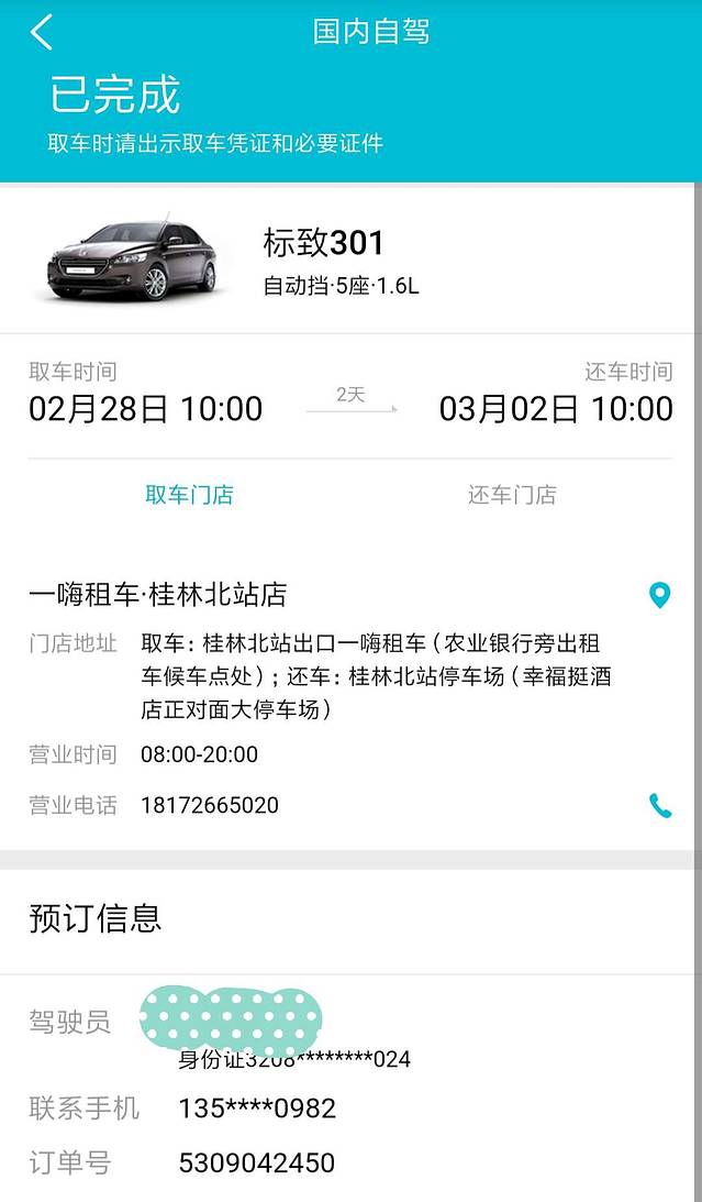 关于租车,现在的租车行业可以说已经算是发展的比较完善了,而且也比从前我们印象中的那种私人租车要规范的多,因此作为我们这种不跟团自己玩的,其实完全可以考虑把自助游升级成为自驾游。对比了两个比较大的租车平台神州和一嗨,两者基本大差不差,但一嗨在桂林北有3万公里以内的新车可以选,而且一嗨是去哪儿网的合作平台,可以直接在去哪儿网下单,所以我们最终选择了一嗨,在去哪儿APP上下单,十分方便。