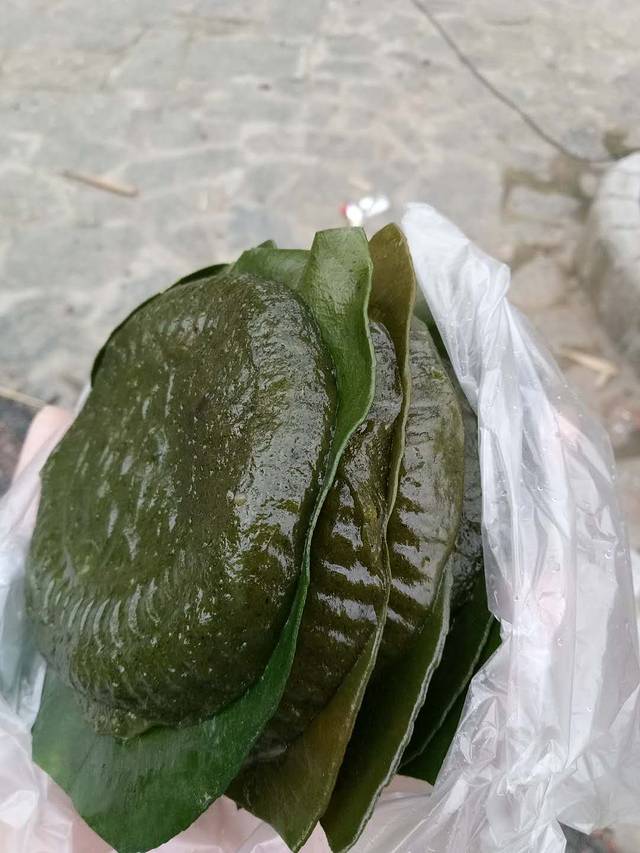 同样是睡到自然睡,然后往遇龙河方向出发,边骑边找早餐,先是在一个小吃店买了几个卷饼,可没想到实在太辣太辣了,吃了一半就吃不下去了。继续往前骑,在一个岔路口有处卖艾粑的,看着很不错,叶子和粑都碧绿碧绿的,很是好看,一口气买了5个