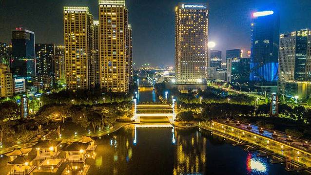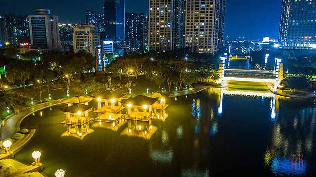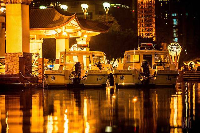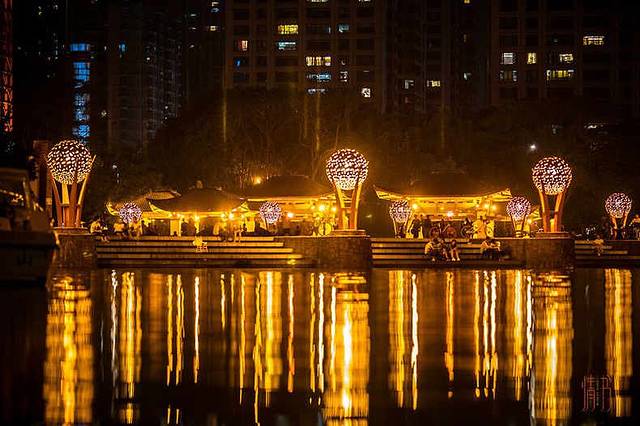 这座占地面积约为302亩的千灯湖现在也成为了佛山的地标,夜晚降临,波光粼粼的湖面上开始倒映出金色的灯火线条。