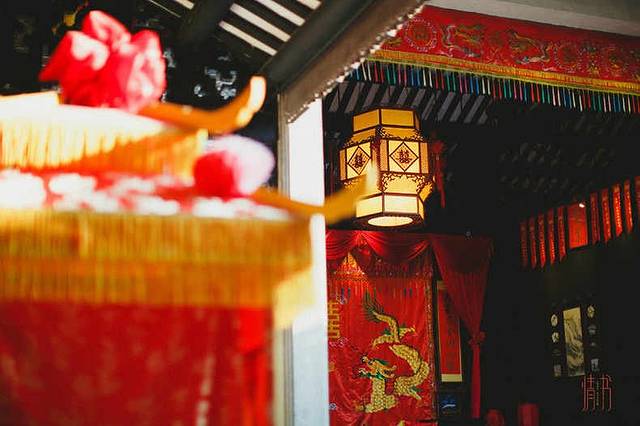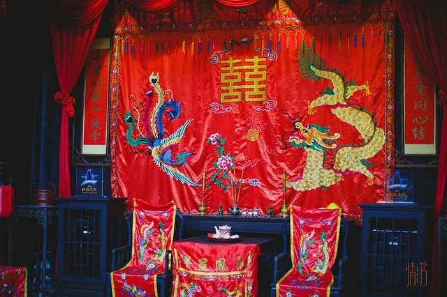 偶遇这拜堂成亲之处,烫金的双喜字旁一龙一凤,在这个不大的小庭院,最热闹的时候莫过于集体婚礼了。