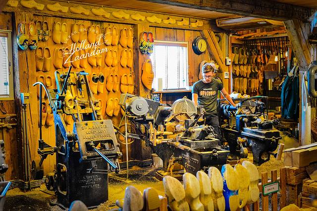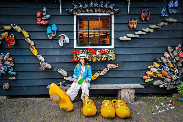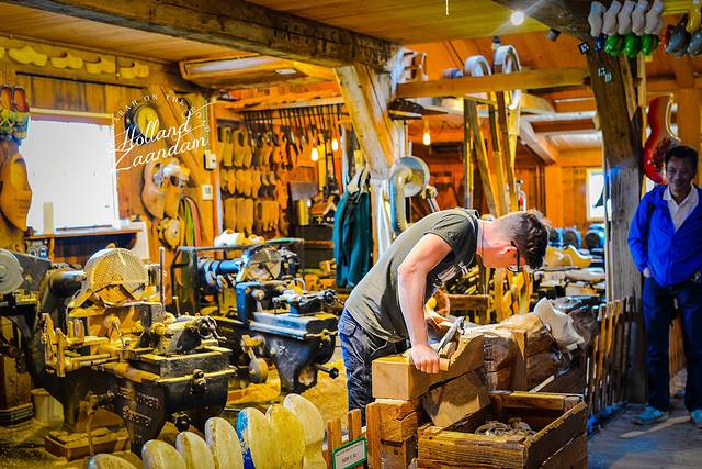 在阿姆斯特丹附近十公里的桑斯安斯风车村Zaanse Schans,有一家纪念品店,门口摆着大大的黄色木鞋,很多游客忙着拍照,忽略了这里内有乾坤,实际上这家是木鞋博物馆。