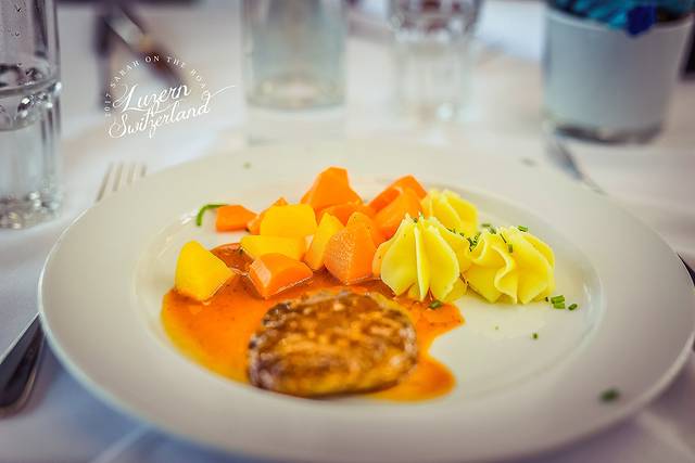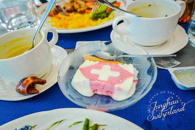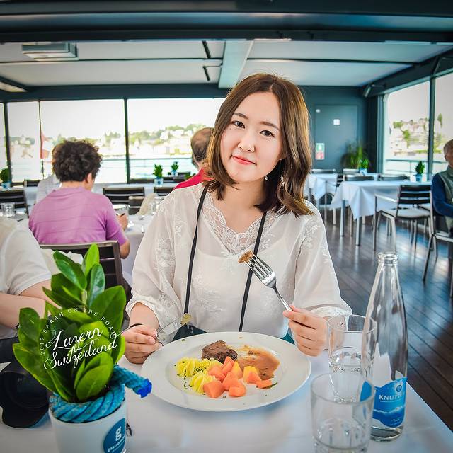 当服务人员把芝士火锅端上来,整个船舱弥漫着臭臭的味道,芝士这味还真有点刺鼻,我拿了面包沾了芝士尝了下,以为会是甜的,结果口感偏咸的,除了浓郁的芝士味还有股酒香,瑞士当地人习惯在芝士火锅出锅前加一点樱桃白兰地