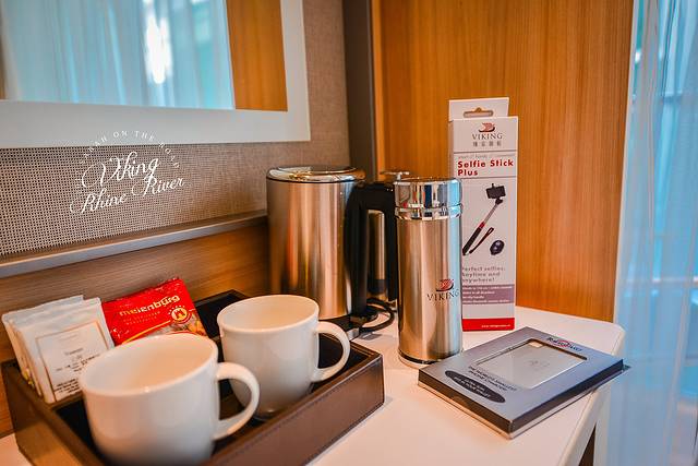 房间里,维京游轮准备了给每个客人一个保温杯,自拍杆和移动电源。