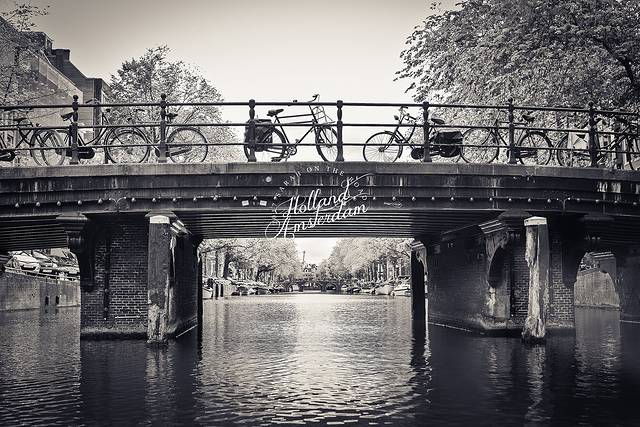 阿姆斯特丹四周被运河环绕,也是座水城,老城里各式各样的桥数不清,桥上总是听着很多自行车。