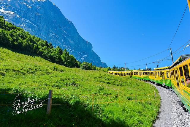 不一会,我们到了做火车的地方,这边会分两段做火车。这辆黄色小火车会先到kleine scheidegg。然后在从这里做红色的高山小火车到达山顶。