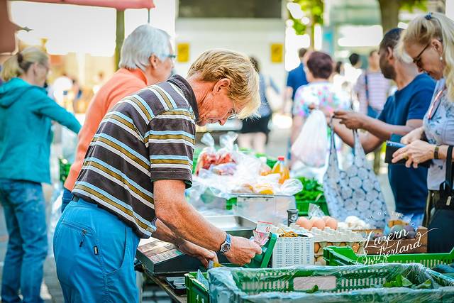 正好在琉森这天是周末,卡佩尔廊桥旁有周末集市,蔬菜摊水果摊奶酪摊,吸引很多当地人来逛,不过当地人买的最多可不是食物,而且是鲜花,瑞士人很爱花,比起关心每天吃什么,更关系家里阳台的花儿,也因为鲜花的点缀显得整个城市那么美。