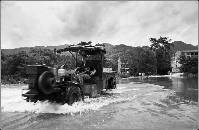 一辆老式拖拉机从对岸“突突突”地开了过来,水花四溅。